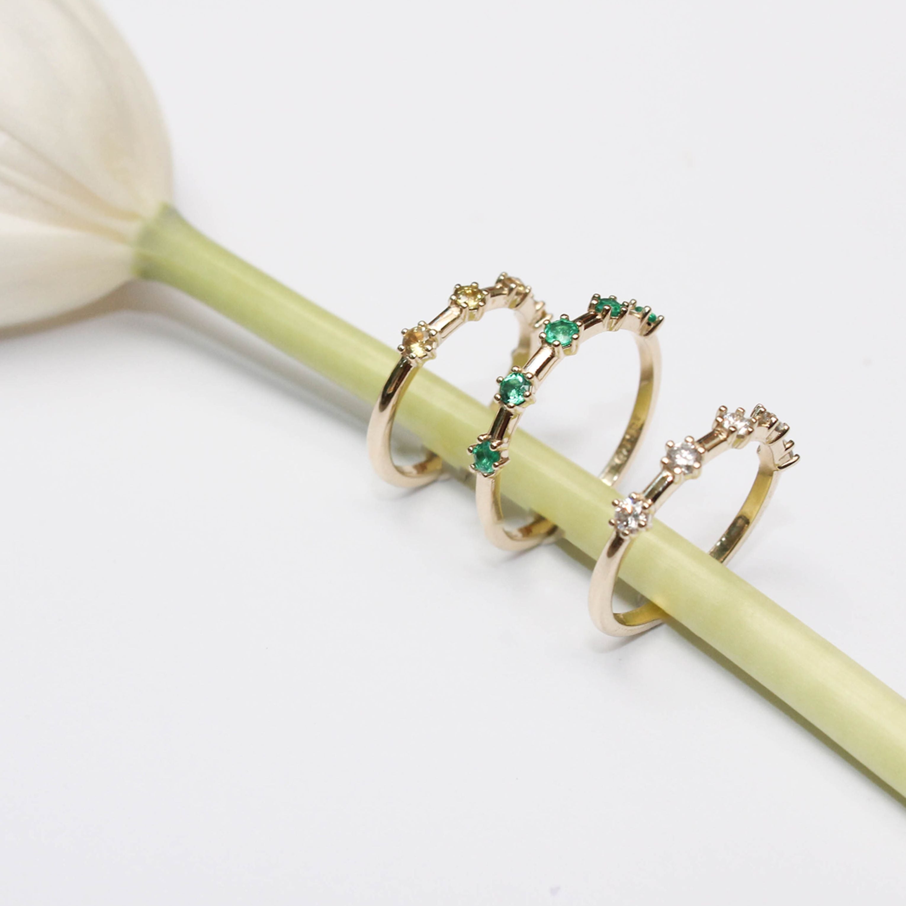 Choose between a selection of Gem Stones resembling beautiful flowers wrapping around your finger: Lab Grown Diamonds, Natural Emeralds or Yellow Sapphire.